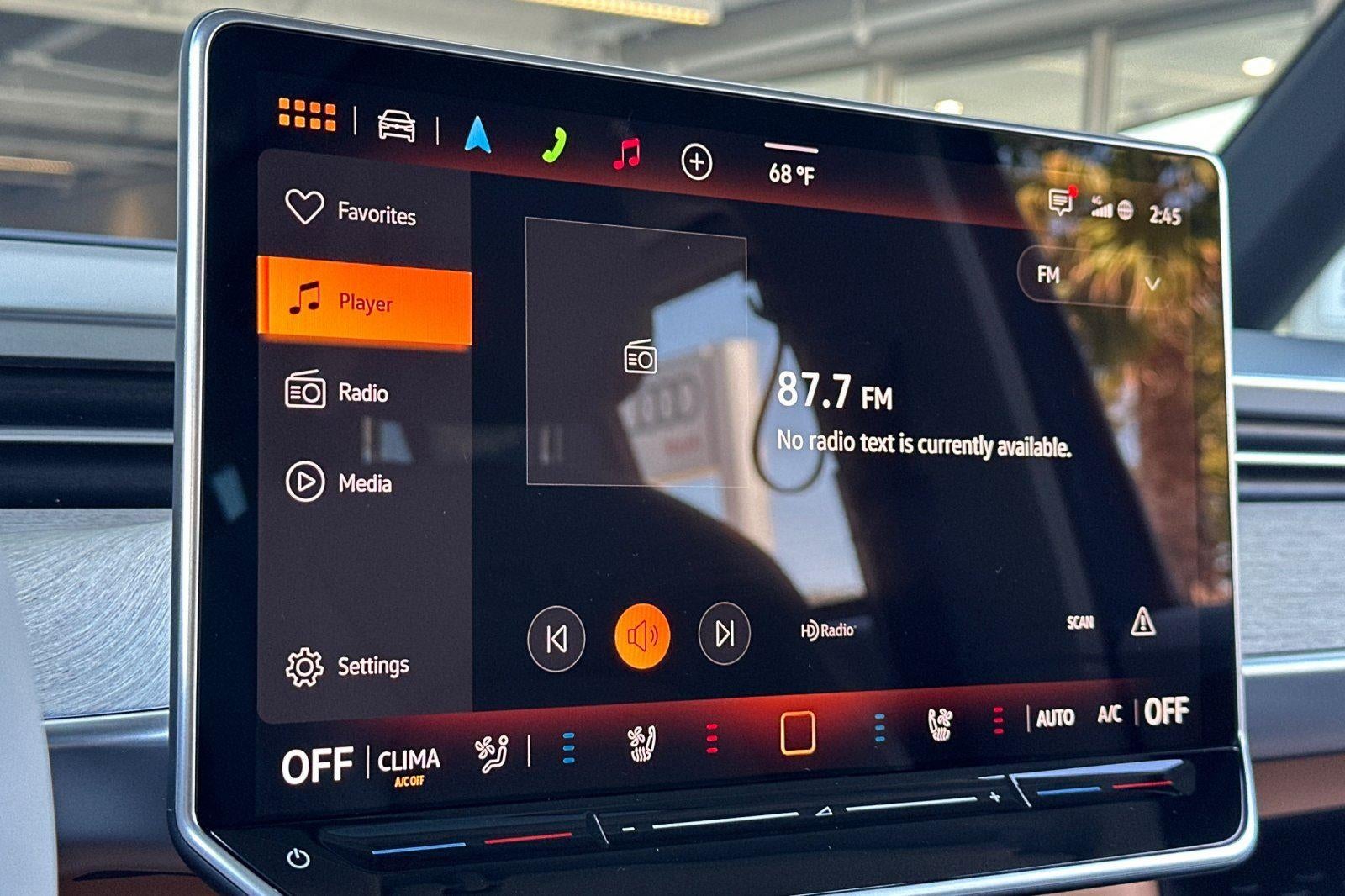 - Radio: Discover Pro Max w/Touchscreen Navigation -inc: 12.9 inch touchscreen multi-function center display w/backlit sliders, FM/HD Radio, WMA/MP3/FLAC media player w/voice control, Harman Kardon premium sound system w/13 speakers, subwoofer and amplifier, Bluetooth® connectivity (for compatible devices), SiriusXM w/360L (w/3-month free trial subscription; must accept SiriusXM terms), App-Connect smartphone integration (w/Apple CarPlay, Android Auto and MirrorLink) via USB, wireless App-Connect smartphone integration (for compatible devices) w/multi-phone pairing capability, capability for in-vehicle 4G LTE enabled Wi-Fi (cellular data plan required; includes limited trial), capability for VW Car-Net services (capabilities for certain services vary; requires enrollment or subscription) and Qi wireless inductive charger (for compatible mobile phones and accessories) in front row